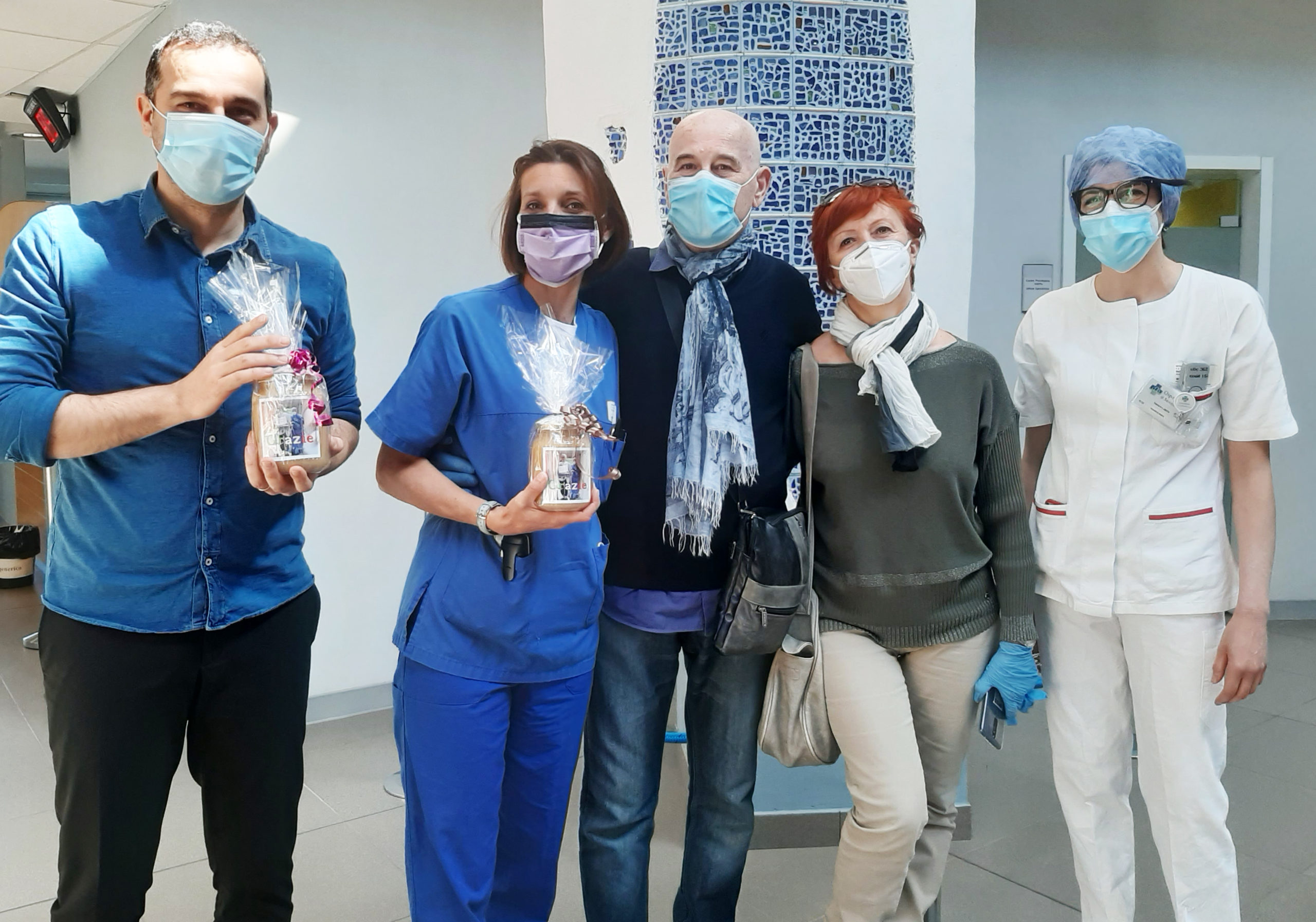 Adesso sta molto meglio, ha vinto la sua battaglia con il virus, e insieme alla compagna ha deciso di tornare in ospedale per portare in dono a tutti gli operatori che lo hanno seguito e assistito, nel difficile periodo della malattia durato quasi 40 giorni, dei vasetti di miele biologico, con tanto di etichetta personalizzata per l’occasione.